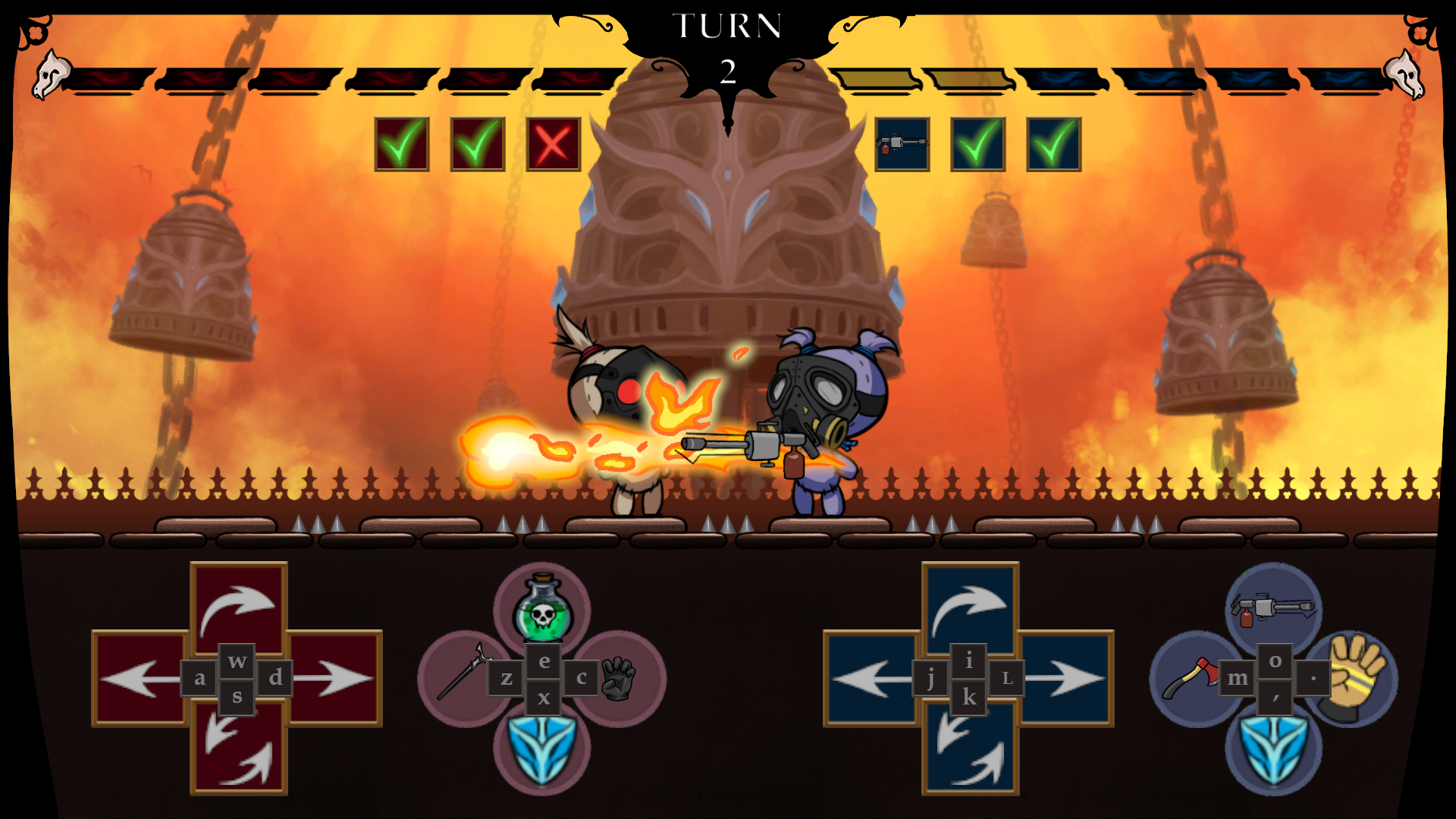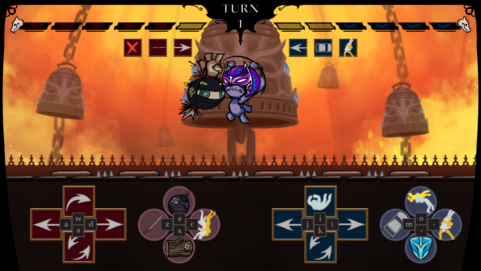 Masked Melee is a local multiplayer turn-based 1v1 fighting game. The objective is to defeat the opponent by attacking them and depleting their health to 0. Players take simultaneous turns by picking 3 actions in secret, then watch the programming play out as the actions are โunmaskedโ one-by-one.